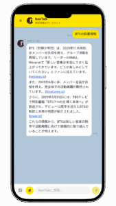 ビジネス・グルメ・観光・夜遊びに加え、K-POP / 韓国ドラマの推し活情報まで。NaviTalkは最初に「何を知りたいか」を聞き取り、会話の文脈に合わせて、必要な情報だけを短く・分かりやすく整理して返します。